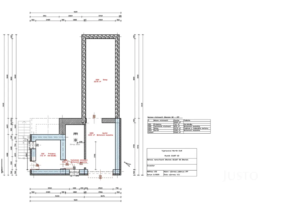 - v 1. PP je prádelna s elektrickým bojlerem 160 litrů, dále technická místnost, dále garáž a dva za sebou navazující klenbové sklepy, jeden s cihlovou klenbou a druhý s kamennou klenbou, celková užitná plocha 1.PP je 53,63 m²