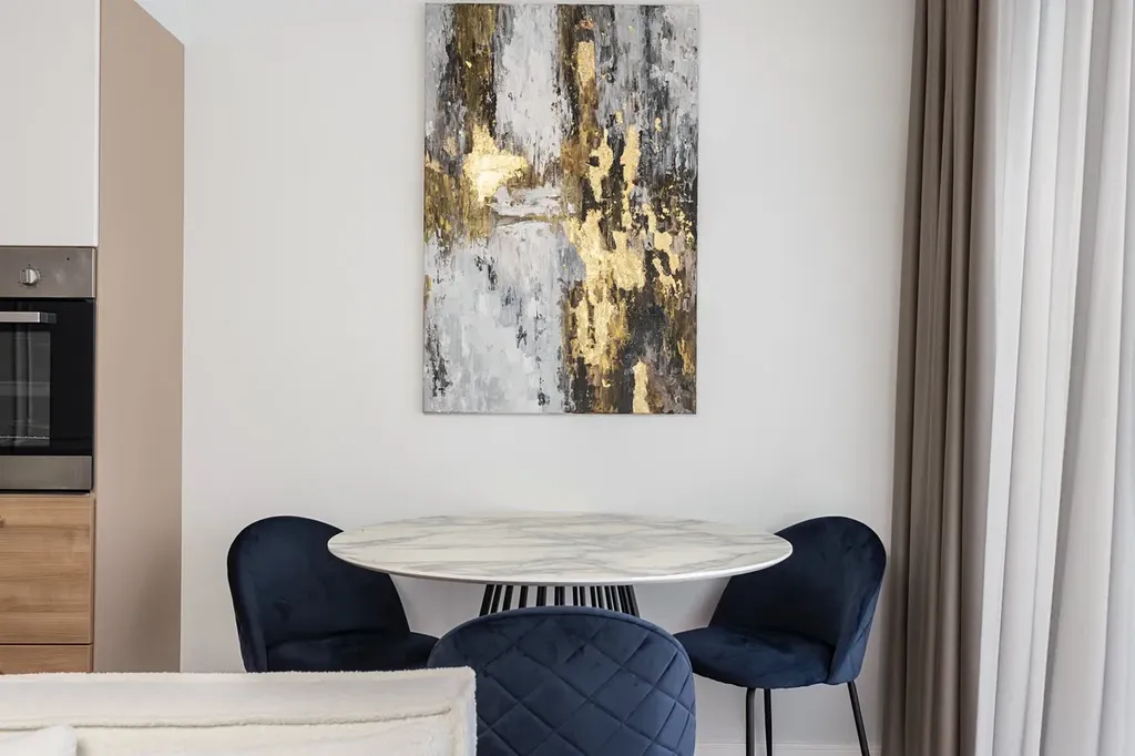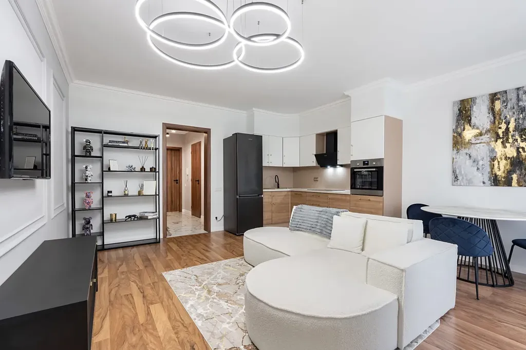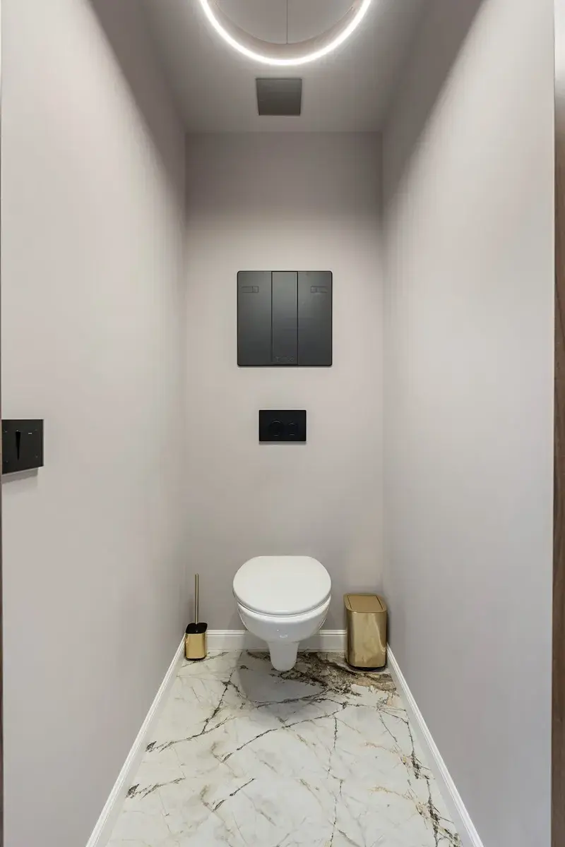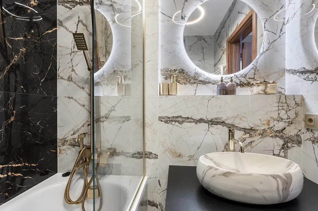 Byt spojuje nadčasovou eleganci s moderními prvky – mramorové detaily, designová svítidla, kvalitní nábytek a textilie.