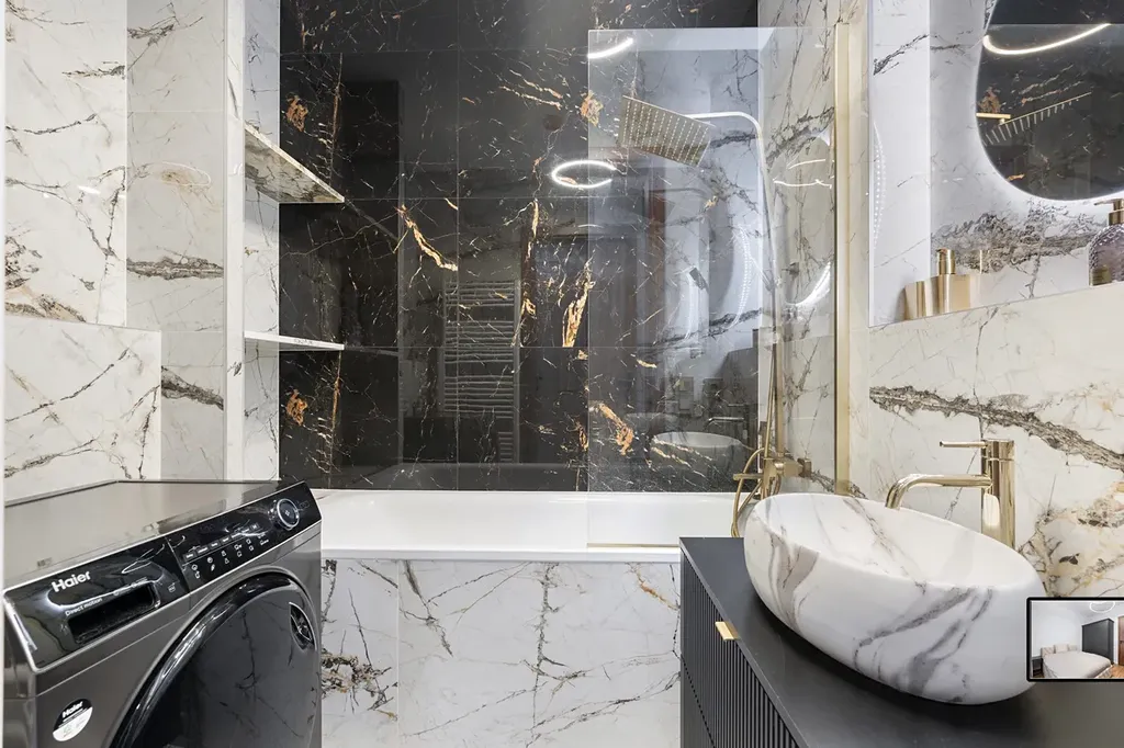 Koupelna s mramorovým obkladem nabízí komfort díky vaně, úložné skříni a pračce se sušičkou.