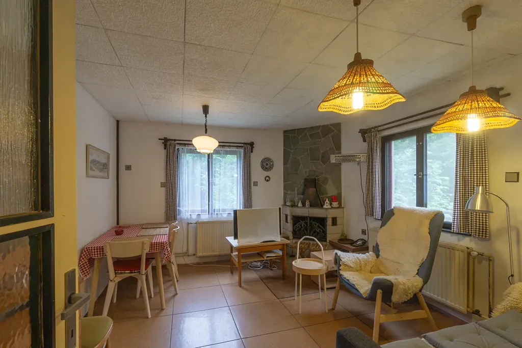• Přízemí (1.NP): vstupní chodba (9 m²), koupelna s WC (1,8 m²), kuchyň s jídelnou (9,1 m²), obývací pokoj s krbem (14,9 m²), malý pokoj přístupný přes obývací pokoj (6 m²), dva samostatné pokoje přístupné z chodby (8,5 m² a 10,2 m²).