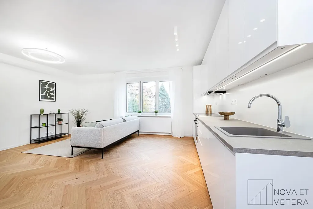 Interiér bytu právě prochází kompletní rekonstrukcí, která zahrnuje nové rozvody elektřiny, vody a odpadu, nové okna, dřevěné podlahy, obklady a dlažby italské značky Marazzi, stejně jako koupelnu a toaletu se sanitou Grohe. Součástí vybavení je kuchyňská linka na míru se spotřebiči prémiové značky Bosch.
