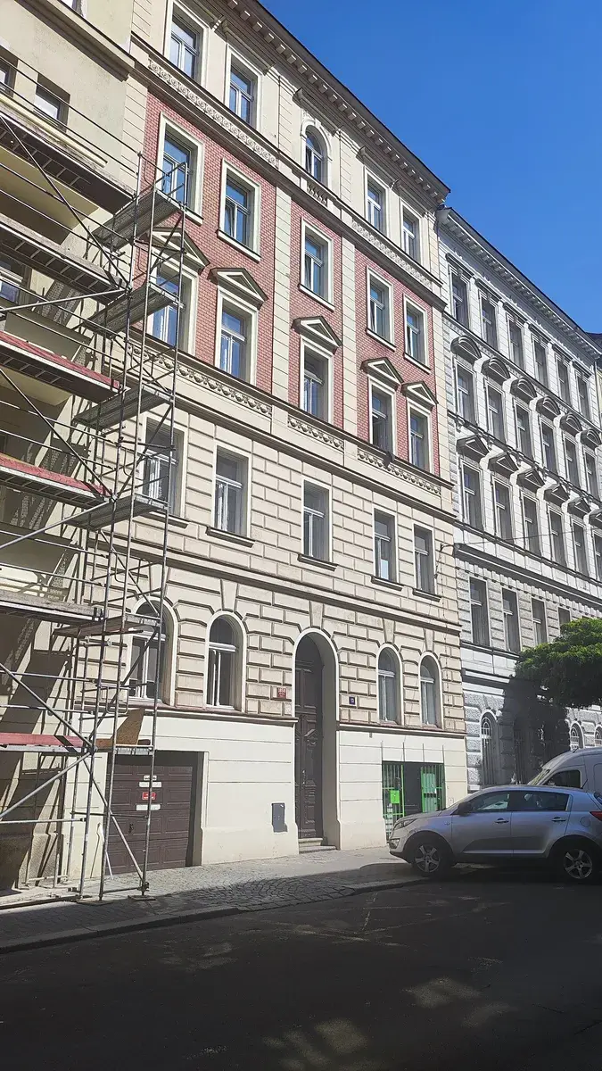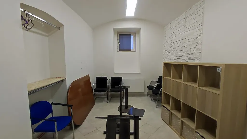 Prostory jsou situovány v 1. PP bytového domu. Nebytový prostor disponuje dvěma hlavními místnostmi, kanceláří a zasedací místností. Další jsou hygienické zázemí, které tvoří samostatná místnost s WC a umyvadlem a sprchovým koutem. Nebytový prostor je ve stavu po rekonstrukci s nízkým opotřebením. Přiložené fotografie zachycují současný stav s hlavním vstupním prostorem s odděleným zázemím pro sklad a druhou, původní, variantu s vybavením a otevřeným prostorem. Omítky štukové, dřevěné okno orientované na jih. Dveře dřevěné plné a prosklené do ocelových zárubní. Podlaha je ve všech místnostech z keramické dlažby. Vytápění - etážové, taktéž řešen ohřev TUV.