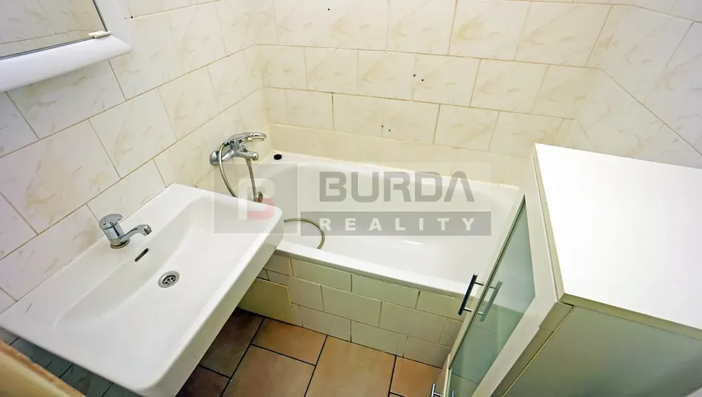 V koupelně je vana, umyvadlo, zrcadlo a skříňka. Koupelnou prochází silná stoupačka vytápění a krásně koupelnu prohřeje.