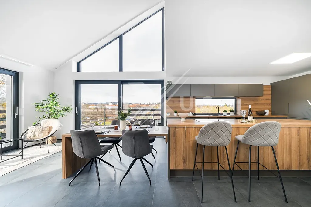 Menší jednotka o dispozici 3+kk má užitnou plochu 125 m² (včetně loftové galerie 18 m²) a k tomu terasu 30 m² umístěnou na zahradě.