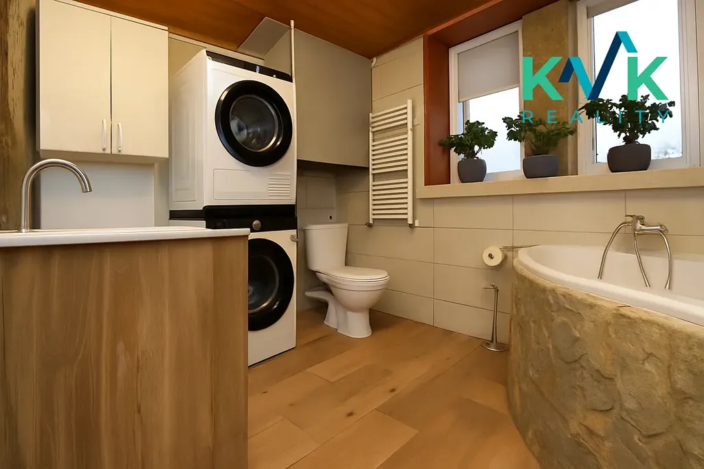 Z obývacího pokoje vede také vstup do ložnice. Obě tyto místnosti jsou orientovány na slunnou jižní stranu, což dodává bytu příjemnou světelnou atmosféru. Kuchyň a koupelna směřují na severní stranu. K bytu náleží velký sklep, umístěný přímo pod bytovou jednotkou a je zahrnutý do celkové výměry bytu. Součástí nemovitosti je také garáž, která je vybavena elektřinou a kamny, což umožňuje komfortní využití prostoru po celý rok. Z garáže je navíc přímý vstup na zimní prosklenou zahradu, ideální pro celoroční posezení, pěstování rostlin či odpočinek i v chladnějším období. Tato kombinace dělá z garáže a zimní zahrady skutečně hodnotné a víceúčelové zázemí. Parkování je možné v garáži nebo pohodlně před domem.