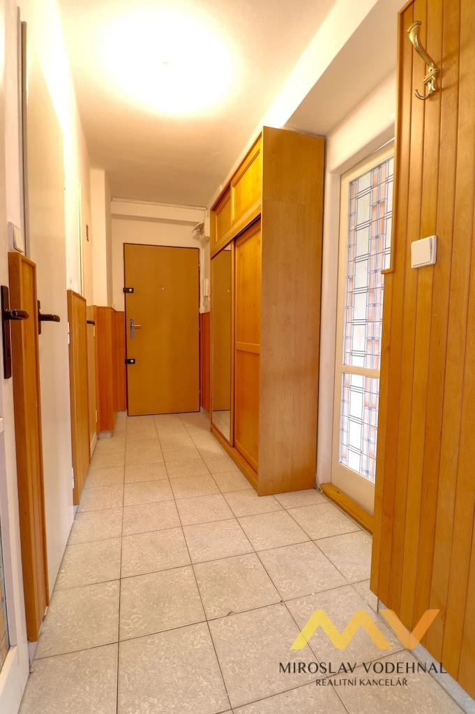 Kuchyň s kuchyňskou linkou a kombinovaným sporákem, spíž, obývací pokoj se vstupem na balkón, další dva pokoje (jeden průchozí), zděná koupelna s vanou a pračkou, samostatná toaleta a prostorná předsíň s vestavěnými skříněmi. V jednom z pokojů je velká vestavěná šatní skříň. K bytu náleží prostorný sklep (5,16 m² ).