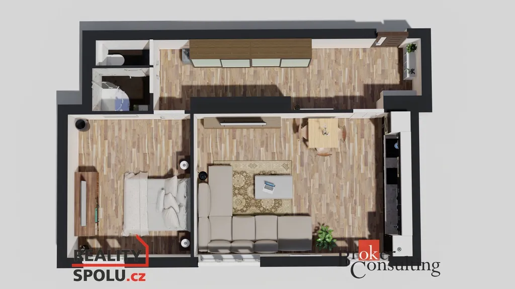 Součástí bytu je prostorná vstupní chodba, která nabízí dostatek místa pro úložné prostory, dále obývací pokoj s moderní kuchyňskou linkou, samostatná ložnice a koupelna s odděleným WC. Byt se pronajímá bez vybavení tudíž si jej nájemník může zařídit dle svého, zůstává pouze kuchyňská linka s vestavěnými spotřebiči.