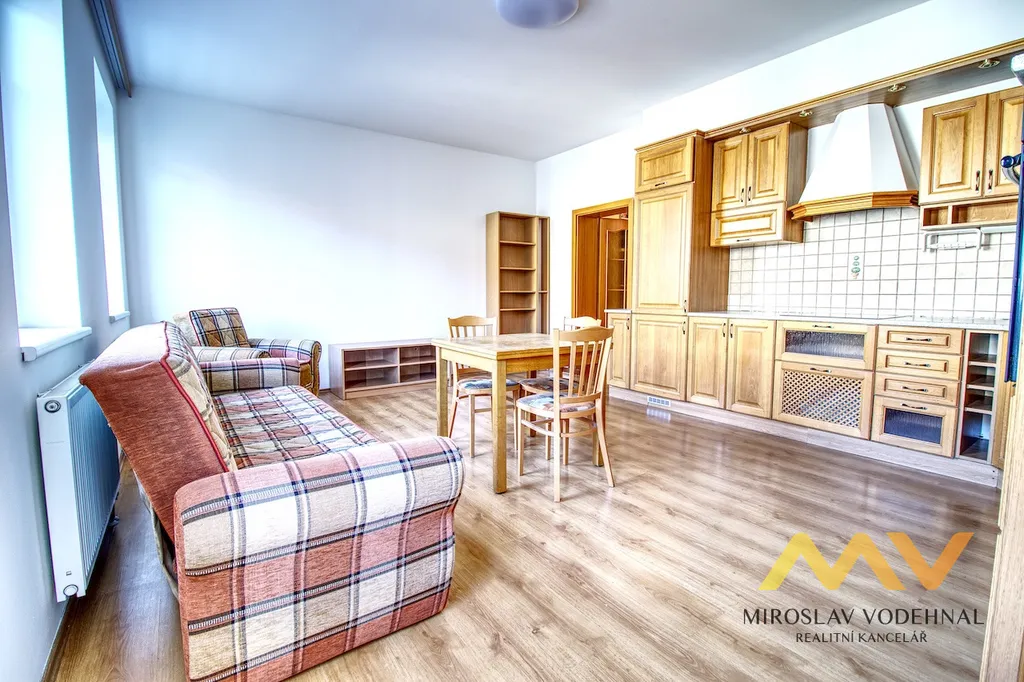 Dispozice bytu zahrnuje obývací pokoj s kuchyňským koutem, ložnici, koupelnu se sprchovým koutem, samostatné WC, předsíň a komoru (2 m²) situovanou na patře. Kuchyňský kout je kompletně zařízen vestavěnými spotřebiči včetně myčky nádobí, elektrické trouby, sklokeramické varné desky, lednice s mrazákem a odsavače par. Dále je k dispozici kompletní nádobí. Obývací pokoj je vybaven pohovkou, křeslem a jídelním stolem se židlemi. Slunná ložnice disponuje manželskou postelí včetně matrací a šatními skříněmi s velkým úložným prostorem. V předsíni se nachází vestavěná skříň.