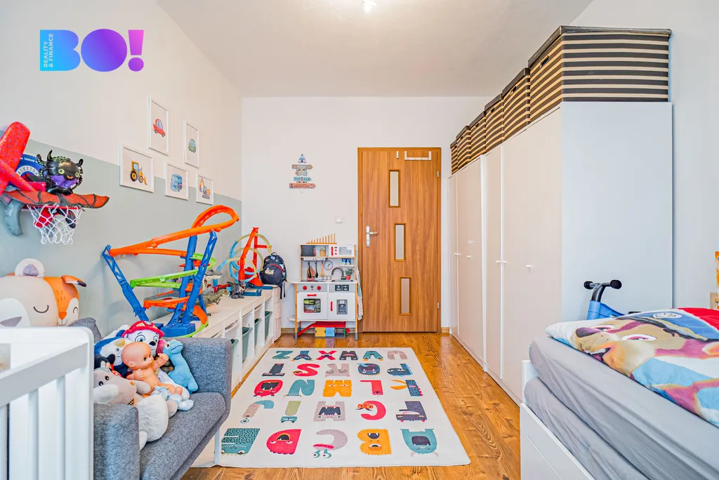 Dispozice potěší zejména rodiny – byt má dva neprůchozí pokoje, oba vhodné jako ložnice či dětské pokoje. Z jednoho z nich je vstup na balkon. Obývací pokoj je propojen s kuchyní, takže rodina může trávit společné chvíle v jednom prostoru.
