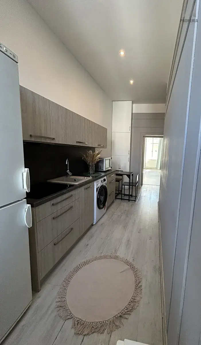 Moderní kuchyňská linka je vybavena varnou deskou, lednicí, mikrovlnnou troubou a pračkou a nechybí ani jídelní stůl se židlemi. Prostor je vzdušný a příjemně prosvětlený.