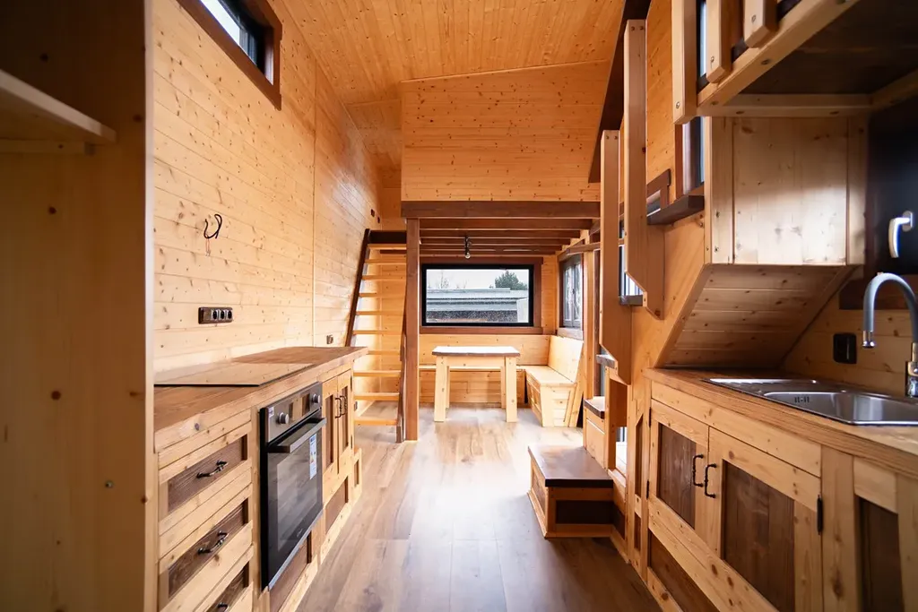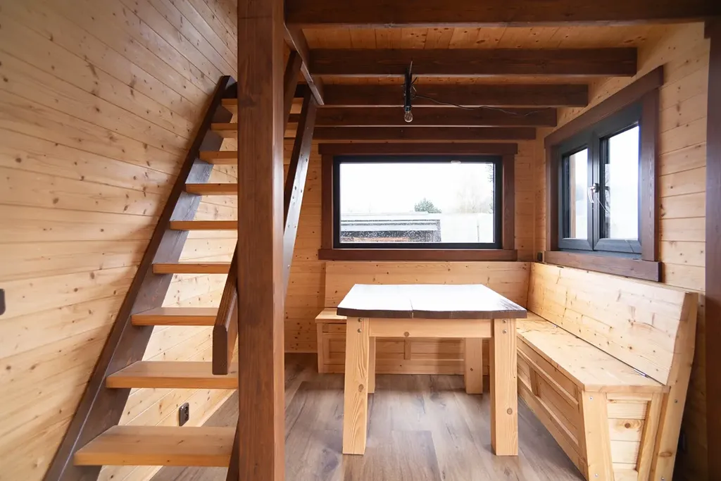 Možnost přimontovat terasu a schody. Výrobní cena byla 1.900.000,- Kč. Je aktuálně zaparkovaný v bezpečném areálu, připraven k odvozu. Stačí zapřáhnout za auto a odjet – Tiny House je okamžitě k dispozici.