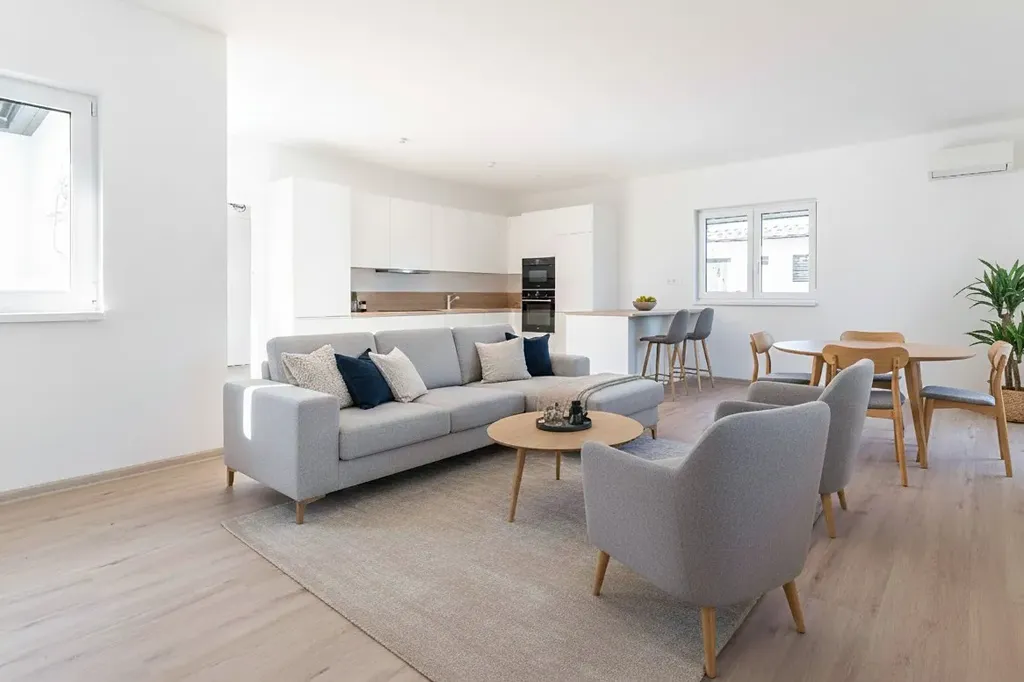 - vinylové podlahy v obytných místnostech, dlažba v koupelnách