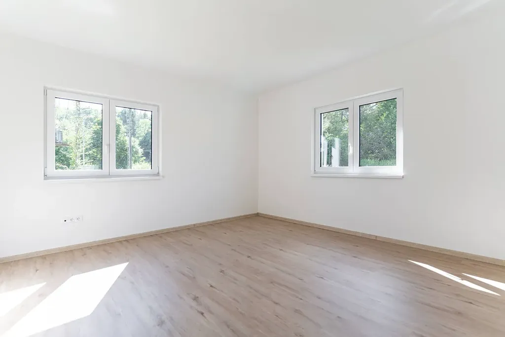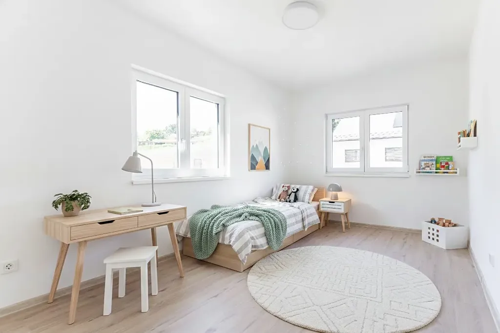 Druhá část domu je věnována dvěma dalším pokojům, které mohou sloužit dětem, hostům či jako pracovna. Nechybí zde ani prostorná koupelna s vanou a praktická komora, která v moderních nemovitostech často chybí. Celý dům působí vzdušně, prostorně a nabízí příjemně prosvětlený interiér po celý den.