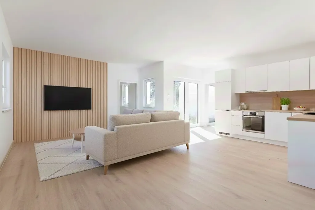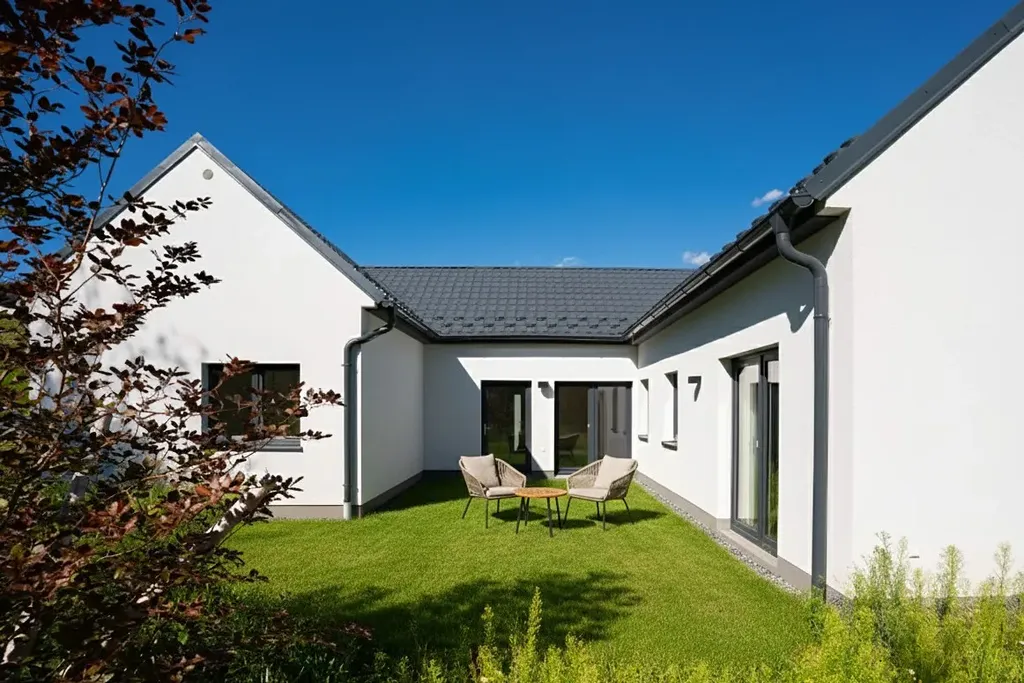 Centrální část novostavby do tvaru písmene U tvoří rozlehlý obývací pokoj s přípravou na kuchyňskou linku. Osazena je klimatizace a velké francouzské okno pro vstup na přilehlou terasu orientovanou na jih. Přes praktickou šatnu pak projdete do ložnice, která je příjemně oddělena od rušnějších částí domu. I zde je interiér harmonicky propojen s terasou dalším francouzským oknem. Ložnice navíc nabízí vlastní koupelnu se sprchou a WC – komfortní řešení, které budete denně oceňovat.