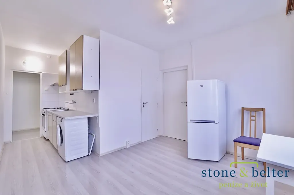 Kuchyně je vybavena kombinovaným plynovým sporákem, digestoří a úložnými skříňkami. K dispozici je také lednice a pračka. Jeden z pokojů je vybaven postelí s úložným prostorem. Součástí bytu je velká komora.