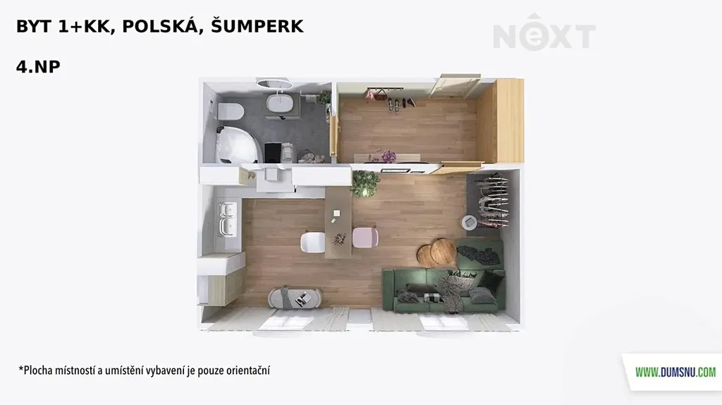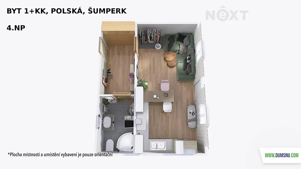 Tento byt v osobním vlastnictví o výměře 36,6 m² se nachází ve 4. nadzemním podlaží historického bytového domu na ulici Polská. K bytu náleží společný sklep a podíl na společném dvorku ve vnitrobloku.