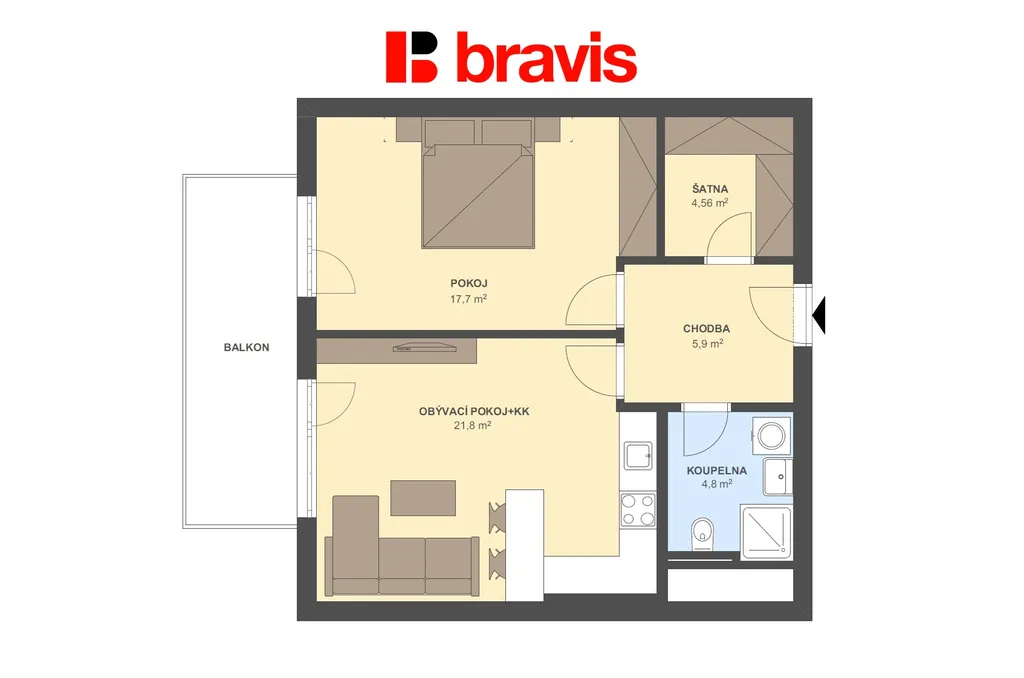 Obývací část pokoje i ložnice se nabízí bez vybavení, takže je zde možnost doplnit si nábytek podle vlastních představ.