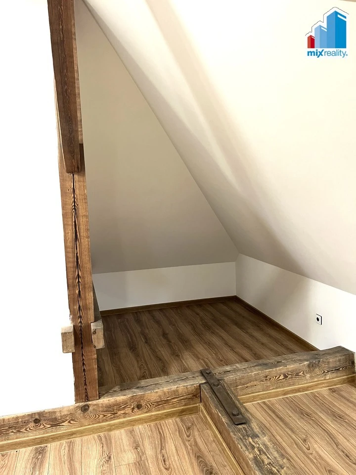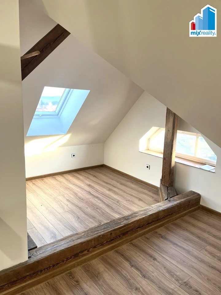 Byt o celkové výměře 100 m² se nachází v podkroví cihlového domu.