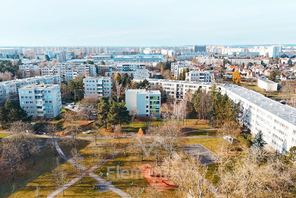 Přímo u domu je dětské hřiště, na které je vidět i přímo z bytu.