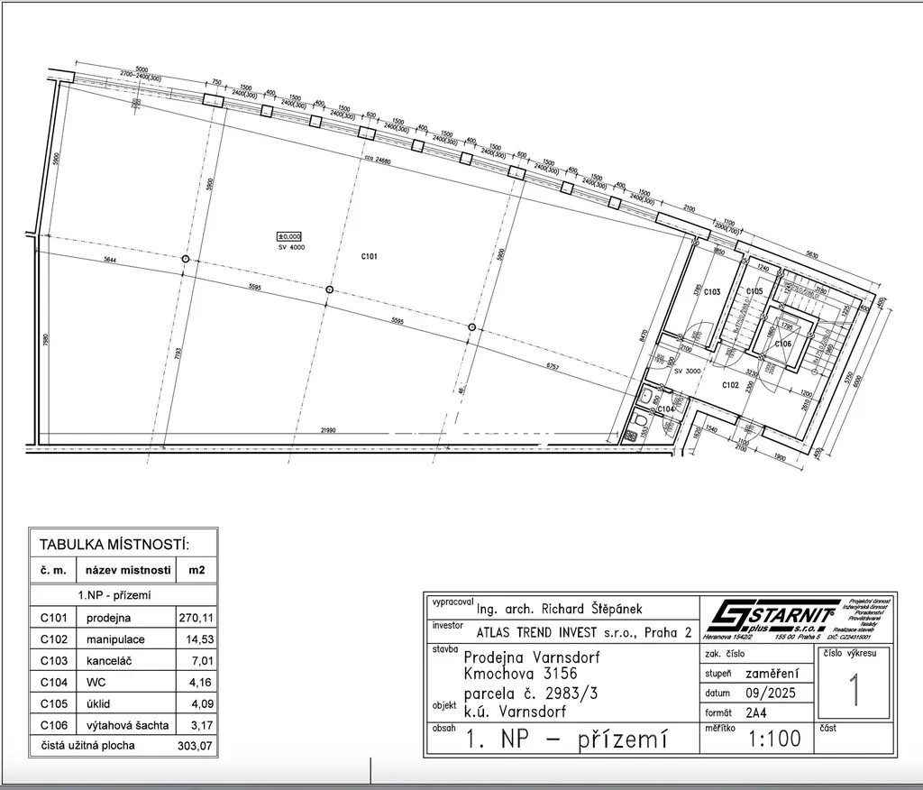 1. NP – prodejní prostor / obchodní část (303,07 m²)