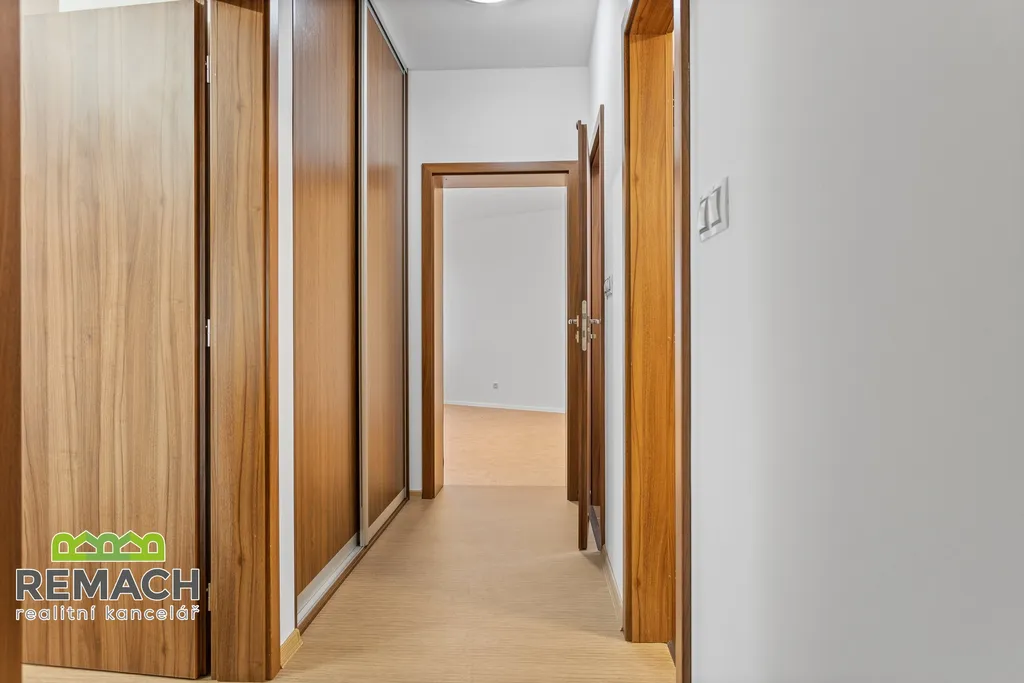 Ve vstupní chodbě vestavná úložná prostorná skříň, botník a věšáková stěna pro komfortní uložení věcí při vstupu do bytu.