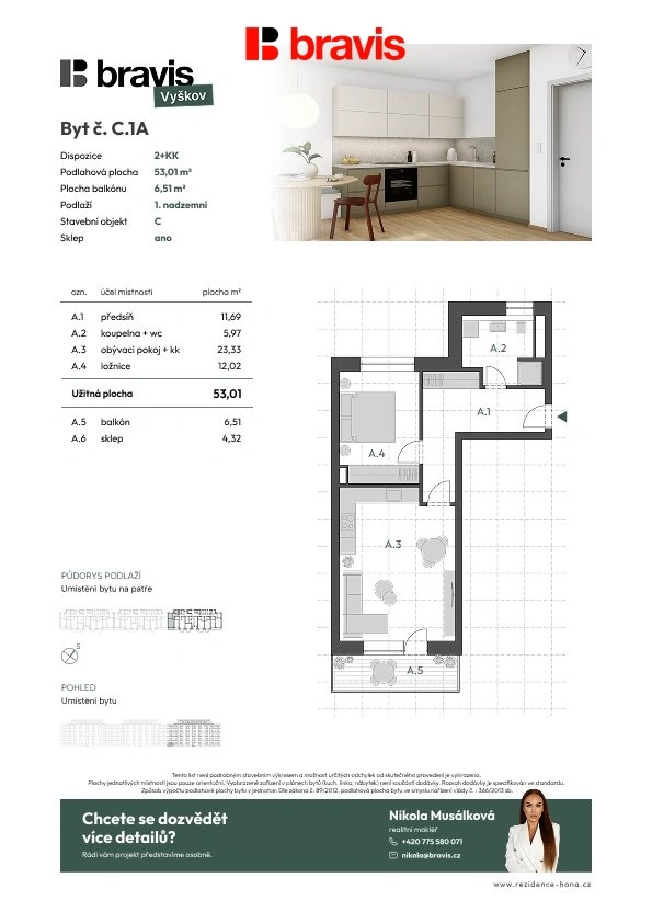 Hledáte nové a moderní bydlení v klidné lokalitě, ale zároveň v blízkosti centra města Vyškov? Právě jste našli Váš vysněný byt! V rámci nového developerského projektu Rezidence Haná u řeky Haná nabízíme k prodeji byt o dispozici 2+kk, označený C.1A, s užitnou plochou 53 m². Byt se nachází v 1. nadzemním podlaží moderního domu, který je v současné době ve výstavbě a garantuje vše, co očekáváte od současného bydlení té nejvyšší úrovně.