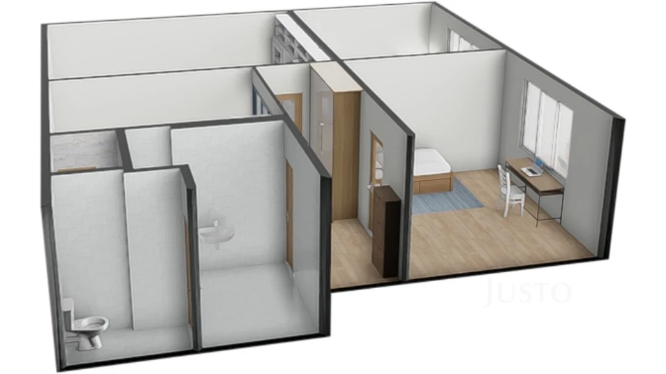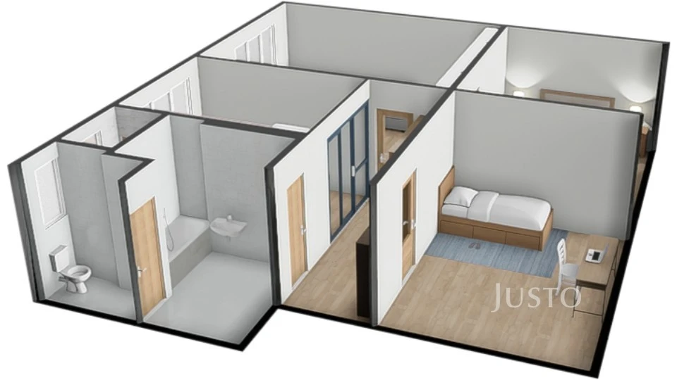 Byt má prakticky řešenou dispozici. Ze vstupní chodby je po levé straně vstup do koupelny vybavené vanou a umístěným plynovým kotlem; koupelna je průchozí na samostatné WC. Z chodby dále vstupujete do kuchyně situované do dvora, odkud je vstup do spíže a dětského pokoje. Naproti vstupu do bytu se nachází obývací pokoj, který je průchozí do ložnice a zároveň z něj vede vstup na balkon orientovaný do vnitrobloku.