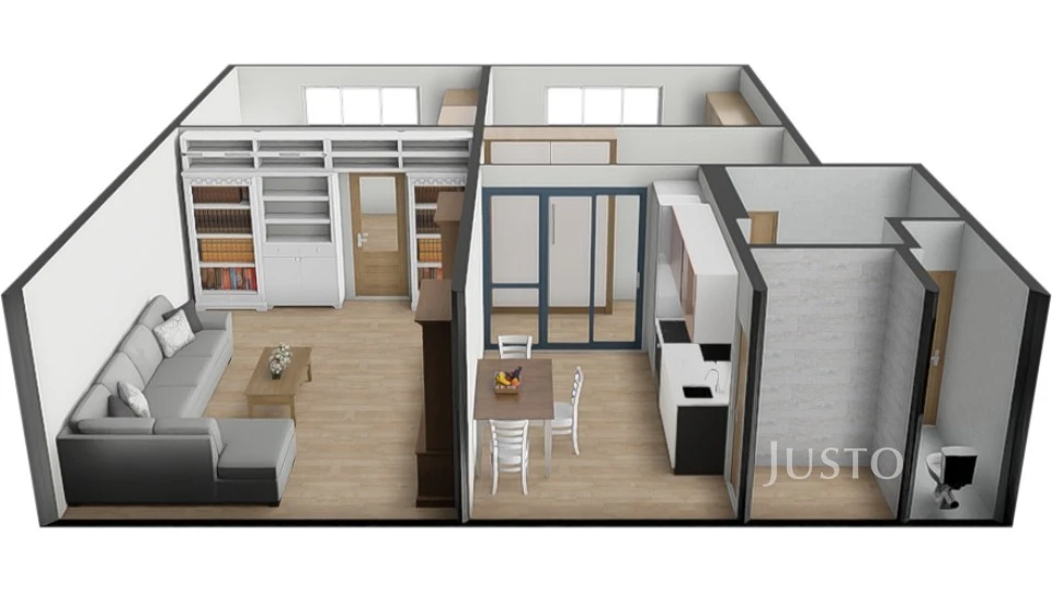 Kuchyně i obývací pokoj jsou orientovány na východ do klidného dvora, oba pokoje – dětský a ložnice – směřují do ulice na západ. Okna do ulice jsou vyměněna za plastová typu euro, do dvora jsou původní dřevěná.