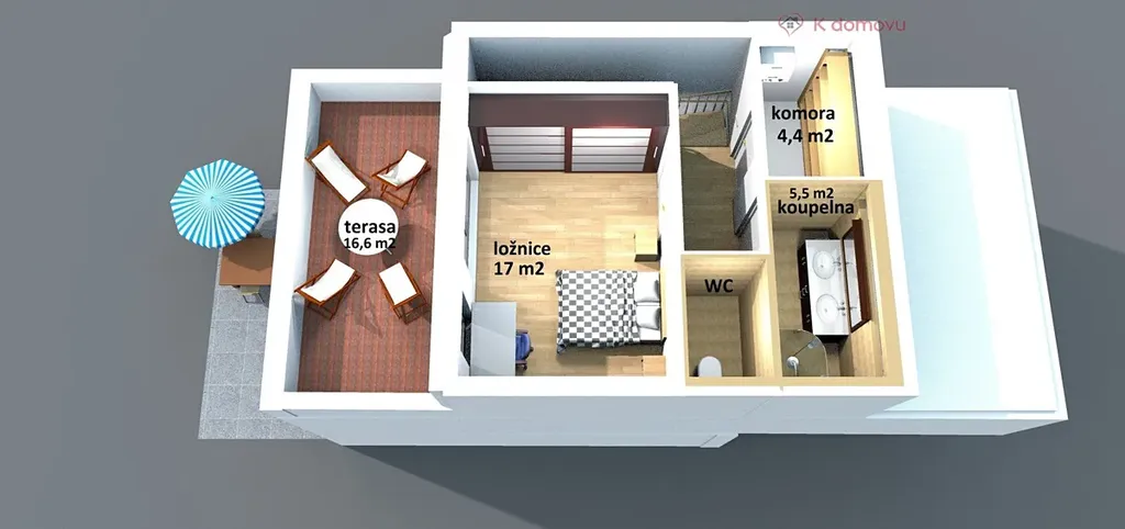 Ve druhém nadzemním podlaží dominuje prostorná ložnice s přístupem na terasu, na které se budete cítit jak v přímořském letovisku. Dále zde naleznete koupelnu, samostatné WC a prostornou komoru.