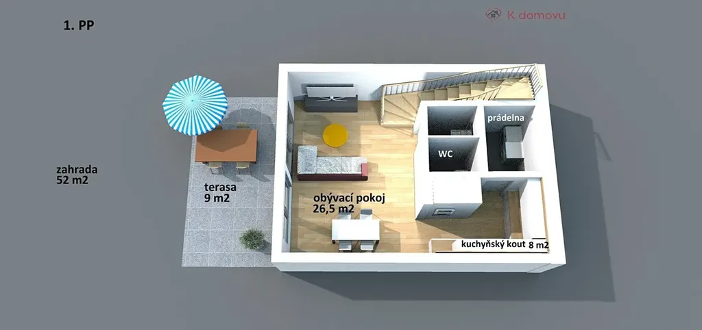 Dům je rozdělen do třech podlaží. V 1. podzemním podlaží se nachází obývací pokoj s kuchyňským koutem, toaletou a místností kde je aktuálně umístěna pračka a sušička. Z obývacího pokoje je vstup na terasu s posezením a navazující zahradu.