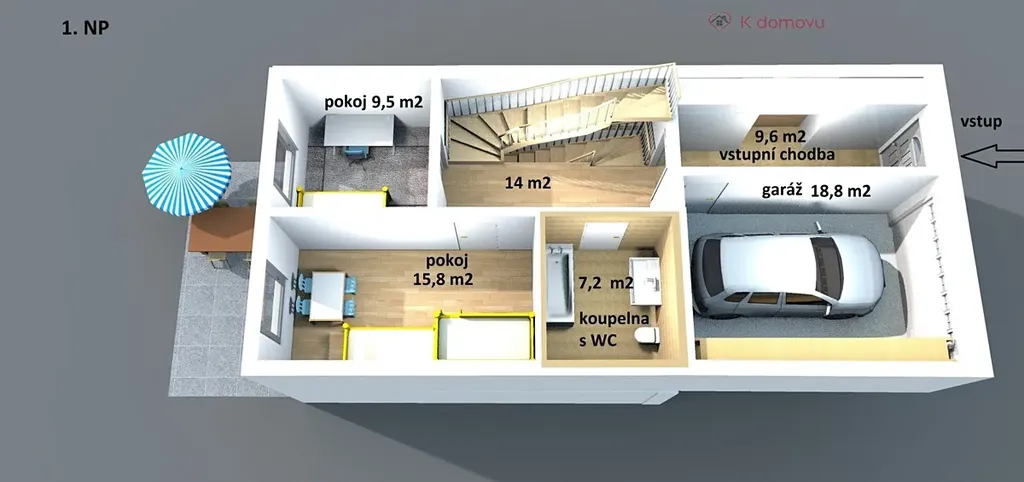Vstup do domu je v 1. nadzemním podlaží přes prostorné zádveří, kam vstoupíte z ulice nebo spojovacími dveřmi z garáže. V tomto podlaží ještě naleznete dva pokoje, koupelnu s WC a prostornou předsíň se schodištěm vedoucí do 2. nadzemního podlaží.