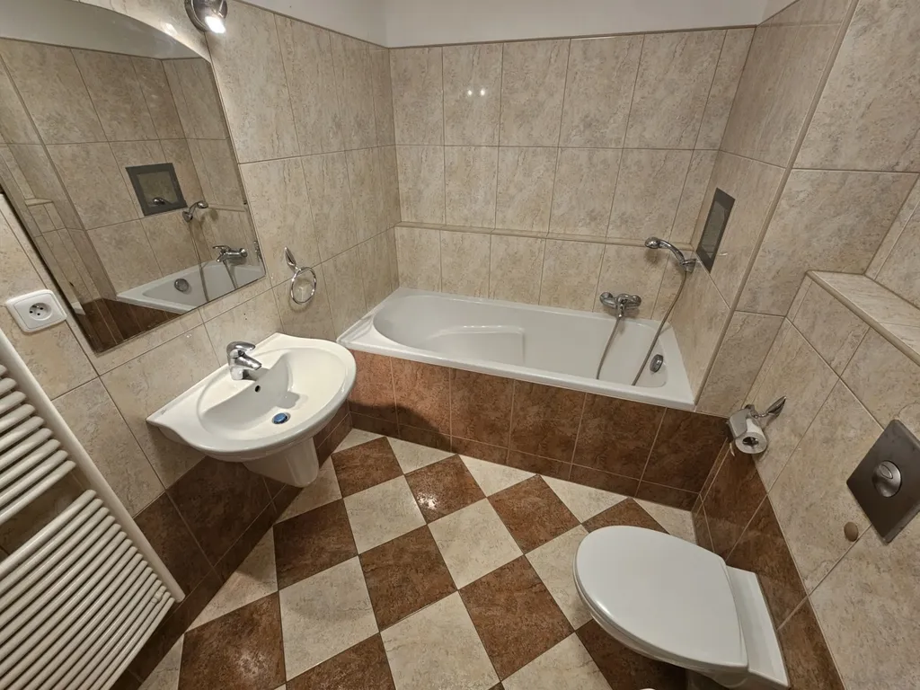 Byt sestává ze vstupní chodby (7 m2), ze které je vstup do oddělené samostatné kuchyně (5 m2), prostorného pokoje (24 m2) a koupelny s WC (5 m2). Byt se nabízí nezařízený nábytkem. K dispozici je kuchyňská linka se sklokeramickou varnou deskou a el. troubou, lednice s mrazákem, myčka a pračka v koupelně. V chodbě jsou velké vestavěné šatní skříně. V prostorné koupelně je vana a WC. Na podlaze je plovoucí podlaha a dlažba. Topení je el. akumulačními kamny. Ohřev vody je bojlerem. K bytu náleží sklep 4 m2 v 1.PP a dále možnost pronájmu garážového stání (15 m2) v 1.PP za 1.500 Kč měsíčně.