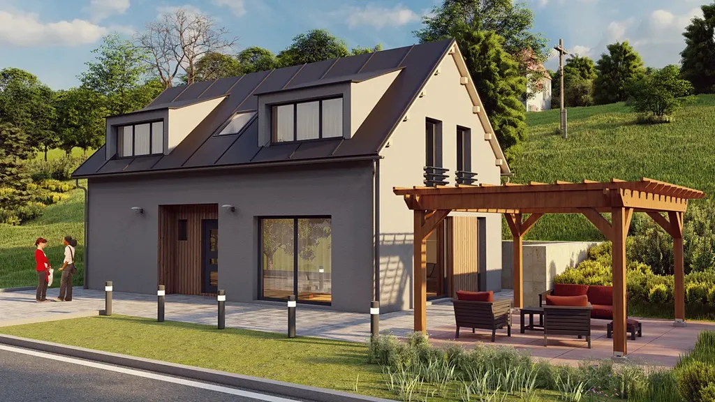 Součástí nabídky jsou vizualizace domu, které ukazují, jak může finální stavba vypadat. Projekt je otevřen úpravám, takže si můžete přizpůsobit vzhled, dispozice i materiály.