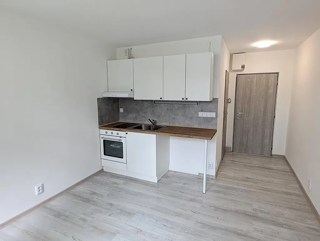 Interiér prošel kompletní rekonstrukcí a působí svěže, moderně a vzdušně. Kuchyňská linka je vybavena elektrickou troubou, sklokeramickou varnou deskou, digestoří a nerezovým dřezem. Pracovní deska v dekoru dřeva ladí s podlahovou krytinou, celkové ladění je minimalistické a funkční.