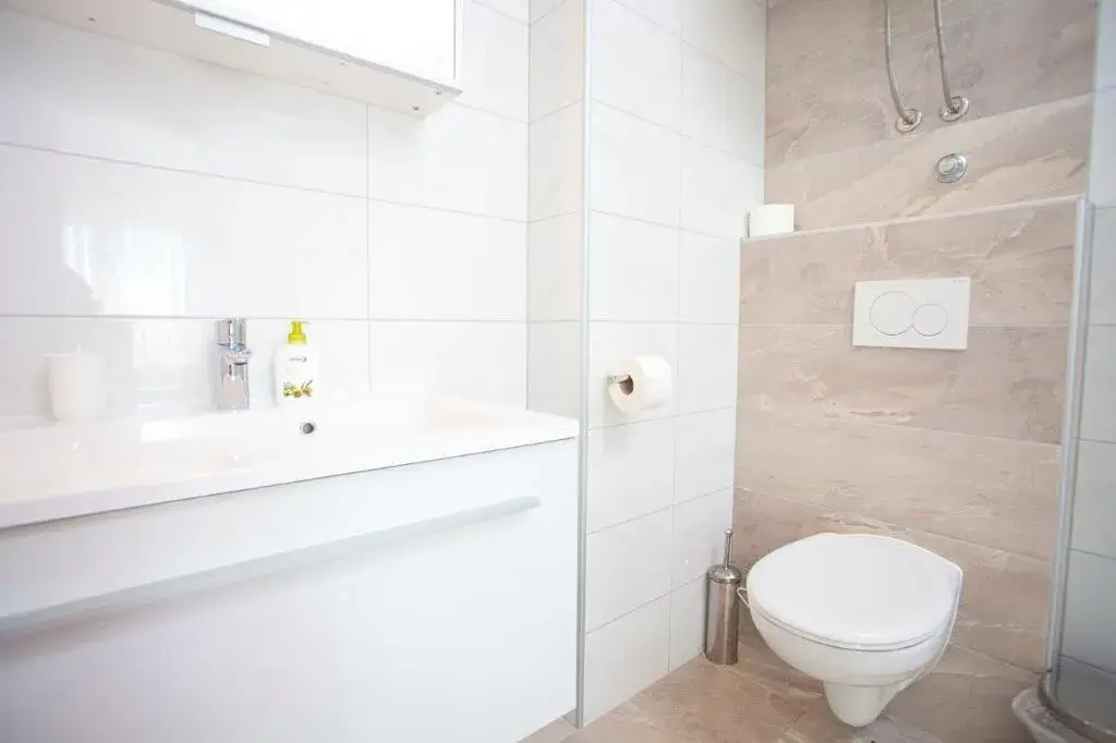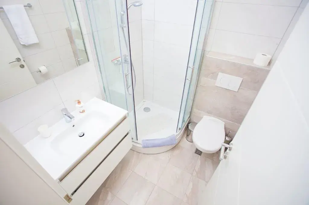 Apartmán o ploše 77,55 m2 se nachází ve druhém podlaží nově postavené čtyřpodlažní budovy s výtahem a sestává z technické místnosti, dvou ložnic, dvou koupelen, obývacího pokoje s kuchyní a jídelnou s přístupem na prostornou terasu o rozloze 12,50 m2 orientovanou na jih s krásným výhledem na moře a ostrovy. Apartmán je kompletně zařízený kvalitním nábytkem, kamennou a keramickou dlažbou, plně vybavenými koupelnami, klimatizací, podlahovým vytápěním v celém apartmánu, má bezpečnostní vstupní dveře, nerezové zábradlí, satelitní TV, internetové připojení, Budova má kvalitní tepelnou a zvukovou izolaci, Při stavbě a interiérovém provedení byly použity nejkvalitnější materiály. K apartmánu náleží jedno venkovní parkovací stání.