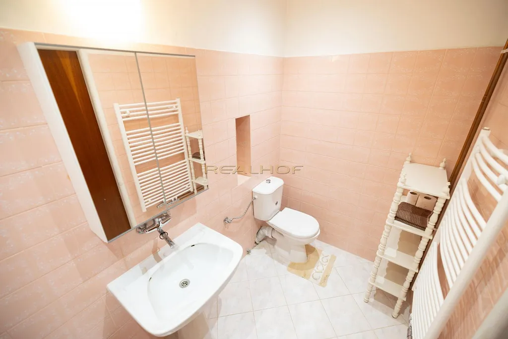 V prvním patře je prostorný obývací pokoj s velkým balkonem, kuchyně s jídelnou a vstupem na zahradu, koupelna s vanou a WC.