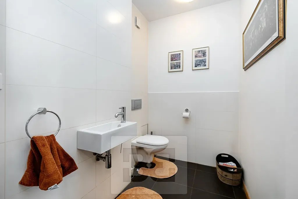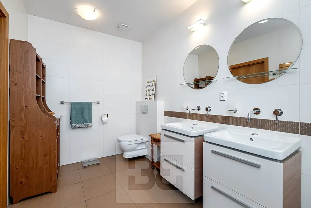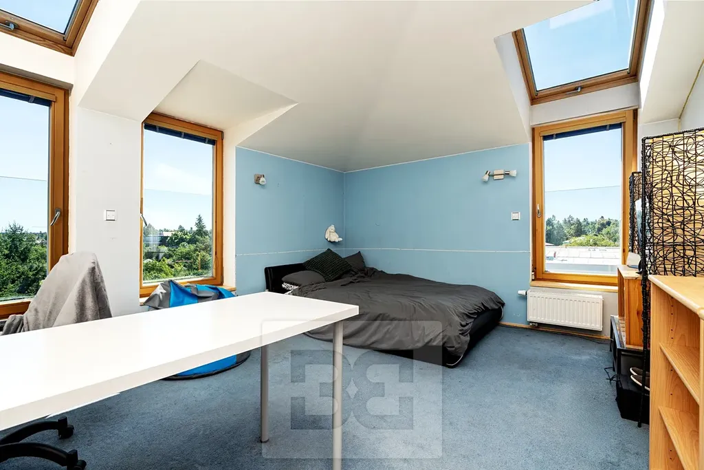 Exkluzivně nabízíme k prodeji velmi světlý byt 7+kk situovaný ve 3. patře (posledním) novostavby s výtahem v centru Průhonic, ul. Uhříněveská s přímým výhledem na místní zámek. Prostorný, slunný byt o celkové ploše 264 m2 se skládá z opravdu velkorysého obývacího pokoje s kuchyňským koutem kompletně vybaveným značkovými spotřebiči, dále pak ze šesti ložnic, dvou koupelen s vanou (jedna se sprchovým koutem) a WC, dvě samostatné toalety, dvě vstupní haly, komory a technické místnosti. Byt je velice vzdušný a světlý díky střešním oknům ve všech místnostech. Obývací pokoj je situovaný směrem do ulice s krásným výhledem na náměstí/zámek. Součástí vybavení bytu jsou vestavěné skříně, klimatizace v každém pokoji, vstupní video-telefon.