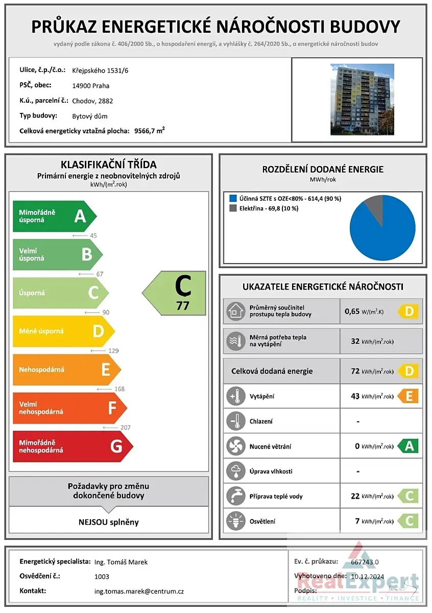 Nabízíme k prodeji hezký, kompletně zrekonstruovaný byt 3+kk (původně 2+1), o celkové ploše 54 m2, situovaný ve 12. NP celkově zrekonstruovaného a zatepleného bytového domu v ul. Křejpského, Praha 4 - Chodov, v blízkosti nákupního centra Billa, Opatovské terasy a EUC polikliniky. Byt se sestává z předsíně, zděné koupelny se sprchovým koutem, samostané WC, kuchyň s oknem, obývací pokoj se vstupem na lodžii s hezkým výhledem, ložnice s vestavěnými skříněmi a dětský pokoj, který vznikl úpravou dispozice původní kuchyně a koupelny. Byt je vybavený kuchyňskou linkou se spotřebiči, obývací pokoj je klimatizovaný vlastní klimatizační jednotkou. K bytu náleží komora a sklep. Dům je zateplený, má plastová okna, nové výtahy, bezpečnostní a kamerový systém ve společných prostorách. Nízká energetická náročnost (PENB C). Veškerá občanská vybavenost v místě a perfektní dostupnost MHD. Zajímavá příležitost. Doporučujeme.