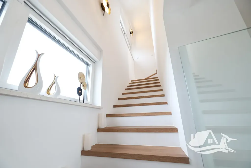 Po venkovním schodišti se vystupuje na střešní terasu s rozlohou přes 40 m², odkud je výhled na moře opravdu dech beroucí a každý západ slunce působí jako malý rituál.