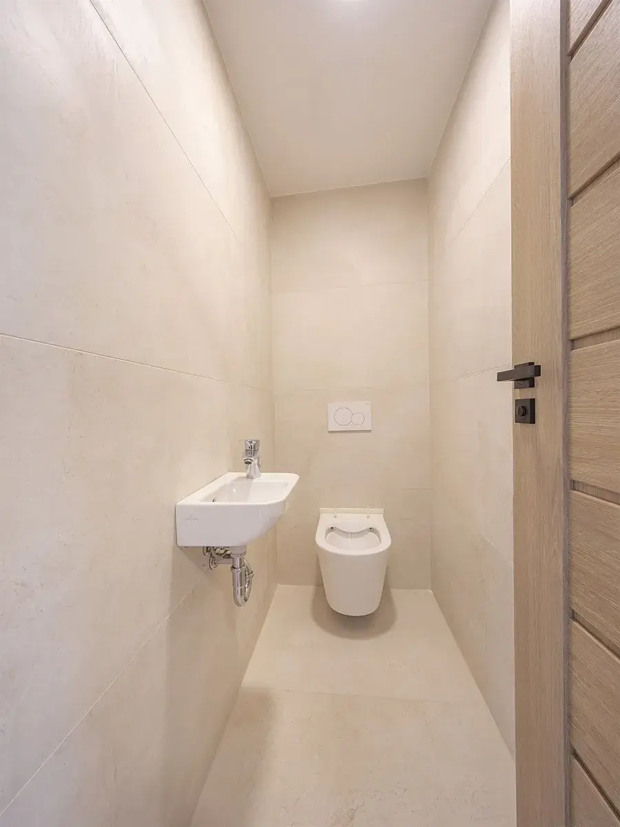 Koupelna je vybavena velkým sprchovým boxem, vanou, umyvadlem, přípravou na pračku a otopným žebříkem.