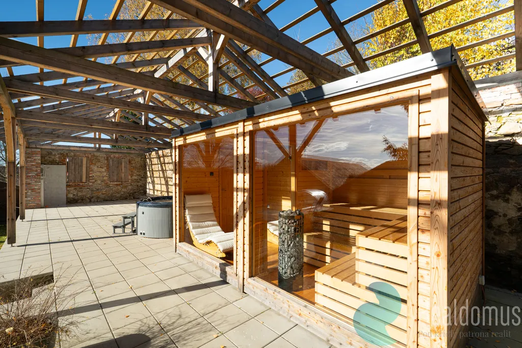 Na krásné relaxační zahradě se vzrostlými stromy je umístěno wellness: krytý bazén, sauna, vířivka, ochlazovací káď a venkovní terasa s posezením a grilem.