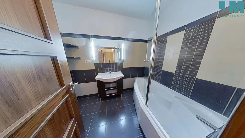 Koupelna je vybavena vanou, umyvadlem se skříňkou a osvětleným zrcadlem, toaleta je samostatně.