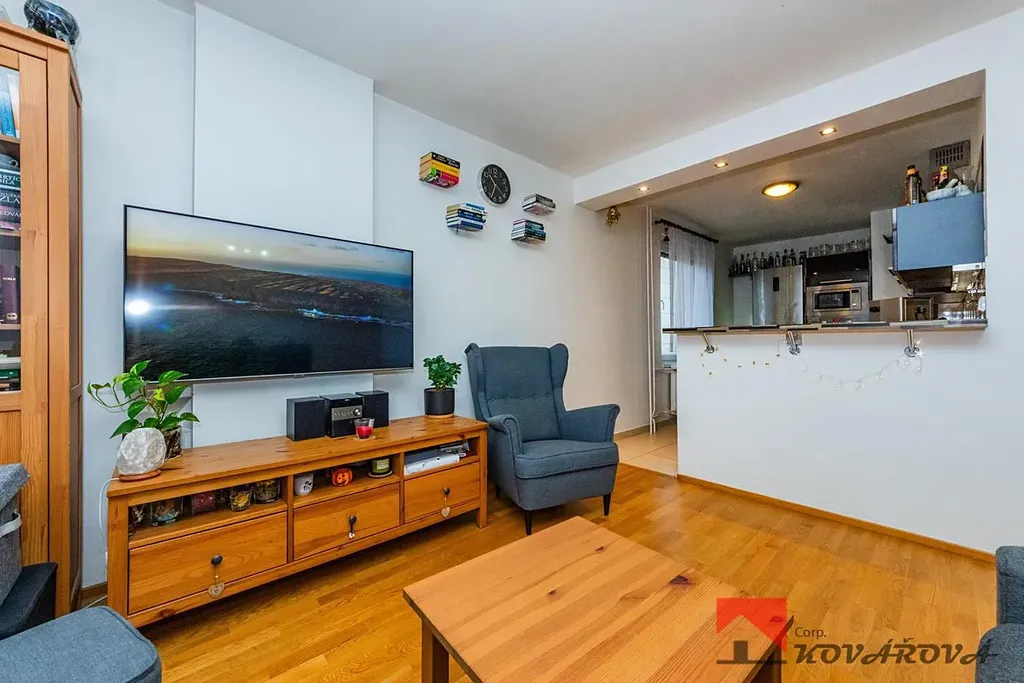 Kuchyň, obývací pokoj, ložnice, koupelna se sprchovým koutem a WC, šatna. K bytu náleží komora na chodbě a prostorný sklep. Velkou výhodou je prostorná lodžie, která nabízí příjemné posezení a možnost pozorovat krásné západy slunce. Součástí vybavení je také vestavěná skříň. Vytápění je ústřední dálkové. V bytě je k dispozici optické připojení k internetu. Parkování je bezproblémové v okolí domu. Dům je obklopen zelení a nachází se ve velmi žádané a klidné lokalitě.