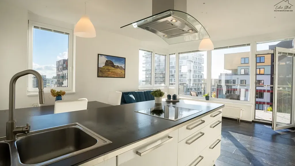 Masivní kuchyňská linka vyrobena míru s praktickým ostrůvkem, vybavená spotřebiči AEG, je navržena tak, aby vám při vaření nic nechybělo. Na velkém stole se pohodlně sejde celá rodina a u pohovky se večer schoulíte s knihou nebo si pustíte televizi. Velká okna pouští dovnitř dostatek světla a když je otevřete, vyjdete na balkon orientovaný na jihozápad. Tenhle směr znamená jediné – dlouhé slunečné odpoledne a večery, kdy tu sedíte s kávou nebo sklenkou vína a koukáte do otevřeného prostoru.
