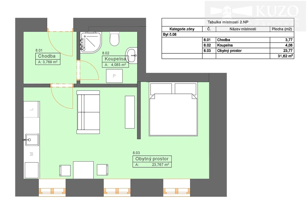 Byt č. 8 – výměra 32 m² – cena 3.200.000 Kč