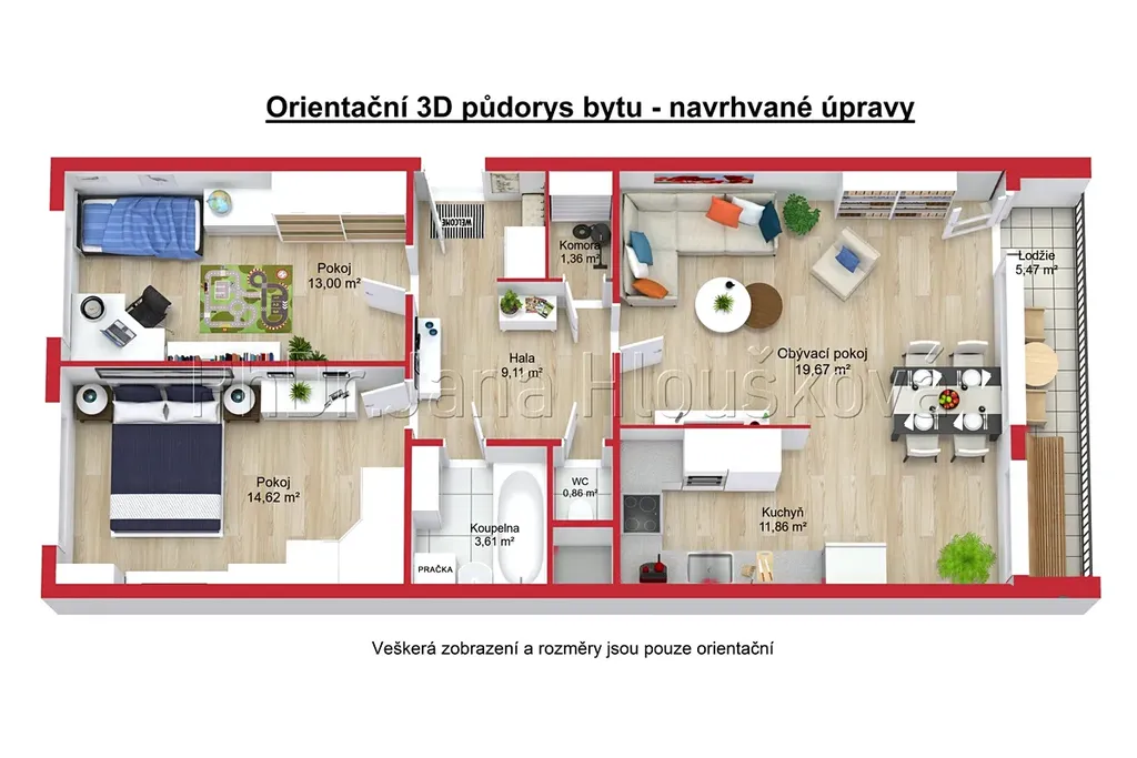Byt má ideální orientaci na dvě protilehlé světové strany – jihovýchod (OP, kuchyň, lodžie) a severozápad (obě ložnice), což umožní jeho přirozené větrání. Interiér prošel před časem částečnou rekonstrukcí, je zde zděné koupelnové jádro, bezpečnostní vstupní dveře, zasklená lodžie, parkety v OP a dlažba nebo plovoucí podlaha v ostatních místnostech. V jedné z ložnic jsou instalovány i venkovní roleta. Centrum bytu tvoří prostorná vstupní chodba, ze které se vchází do všech místností. Vedle prostorného obývacího pokoje se nachází kuchyň, což určitě bude lákat rodiny k propojení obou těchto místností. Jednu z variant, jak by byt mohl vypadat po takové přestavbě, můžete vidět ve vizualizaci i na 3D půdorysu. Ponechat samozřejmě můžete i současnou dispozici bytu, a zachovat tak 3 samostatné neprůchozí pokoje, což uvítají zvláště investoři při následném pronájmu bytu. Současné uspořádání bytu (vč. současného nábytku) a jeho orientační rozměry jsou patrny na 2D půdorysu.