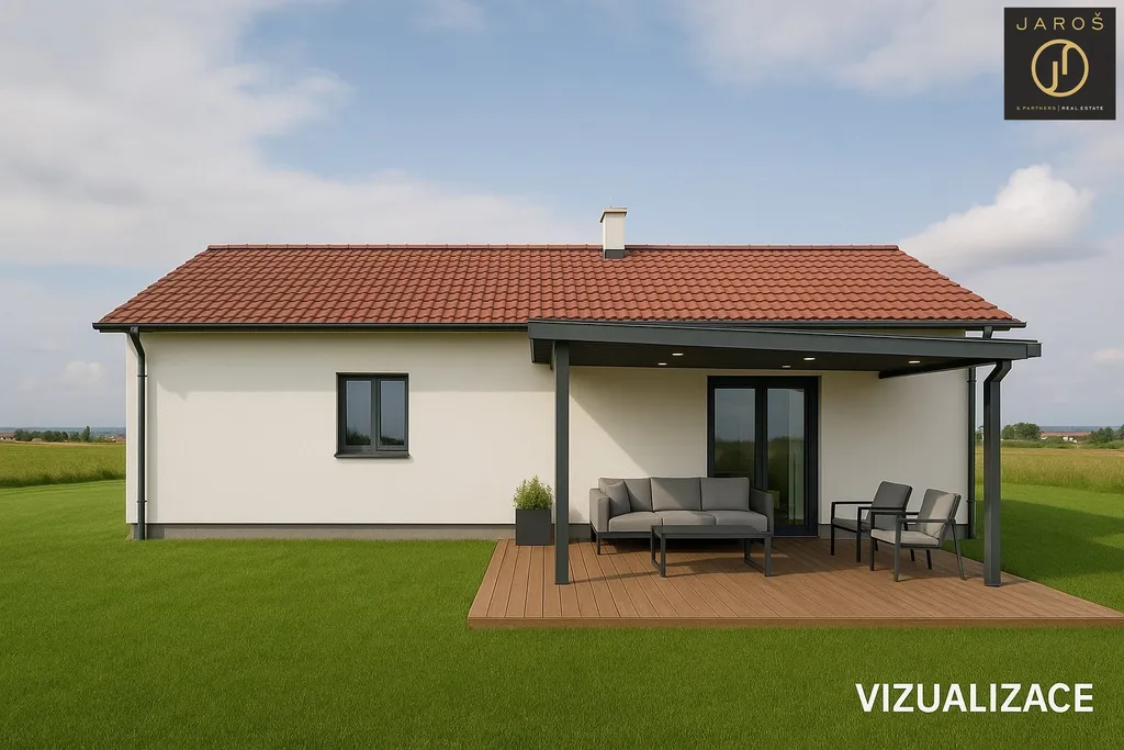 Dispozice domu je navržena tak, aby poskytla maximální komfort pro rodinu: prostorný obývací pokoj s kuchyňským koutem, ložnice se šatnou, dva samostatné pokoje s výhledem do zahrady, koupelna s WC, technická místnost.
