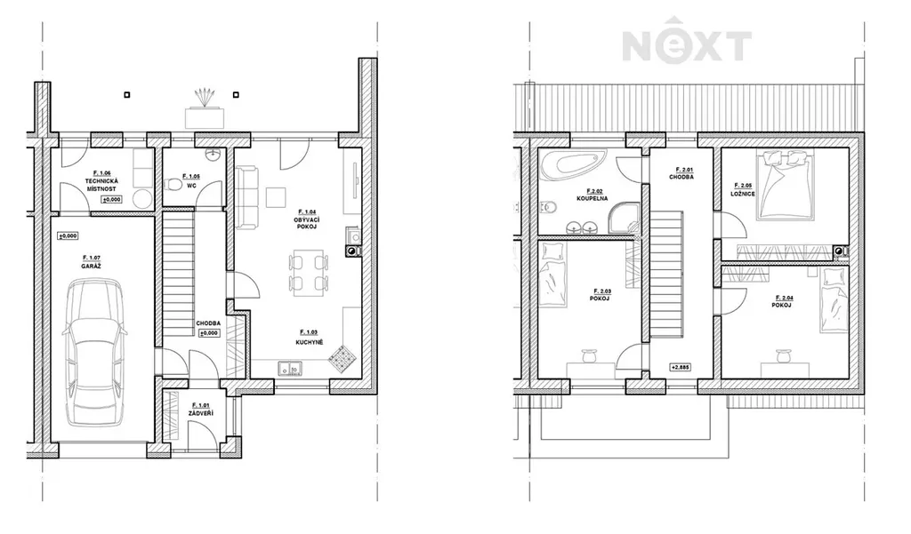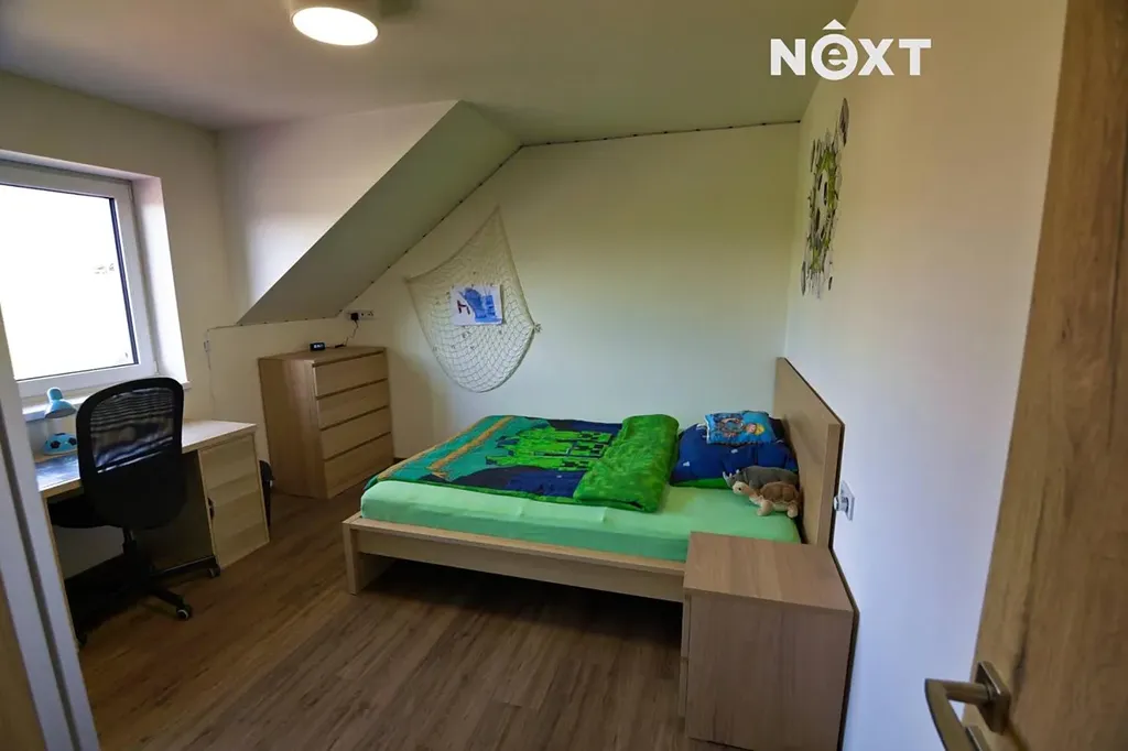 2. NP: Najdete zde tři prostorné ložnice a velkou koupelnu s WC, vanou, sprchou a dvojitým umyvadlem. Z chodby i jedné ložnice je vstup na venkovní balkon s výhledem do klidné části obce.
