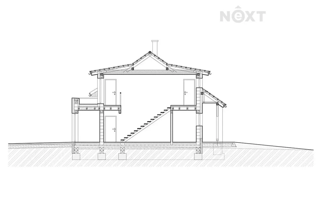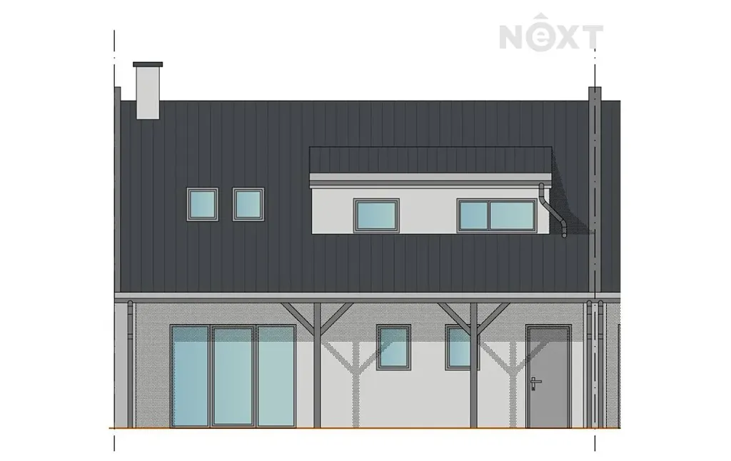 Dispozice domu: 1. NP: Vstupní zádveří navazuje na chodbu se schodištěm, ze které se vstupuje do velkého obývacího pokoje s kuchyňským koutem. Z obytného prostoru je přímý vstup na zastřešenou terasu a zahradu. Z chodby je přístupná garáž, sociální zařízení a také technická místnost s dalším vstupem na terasu.