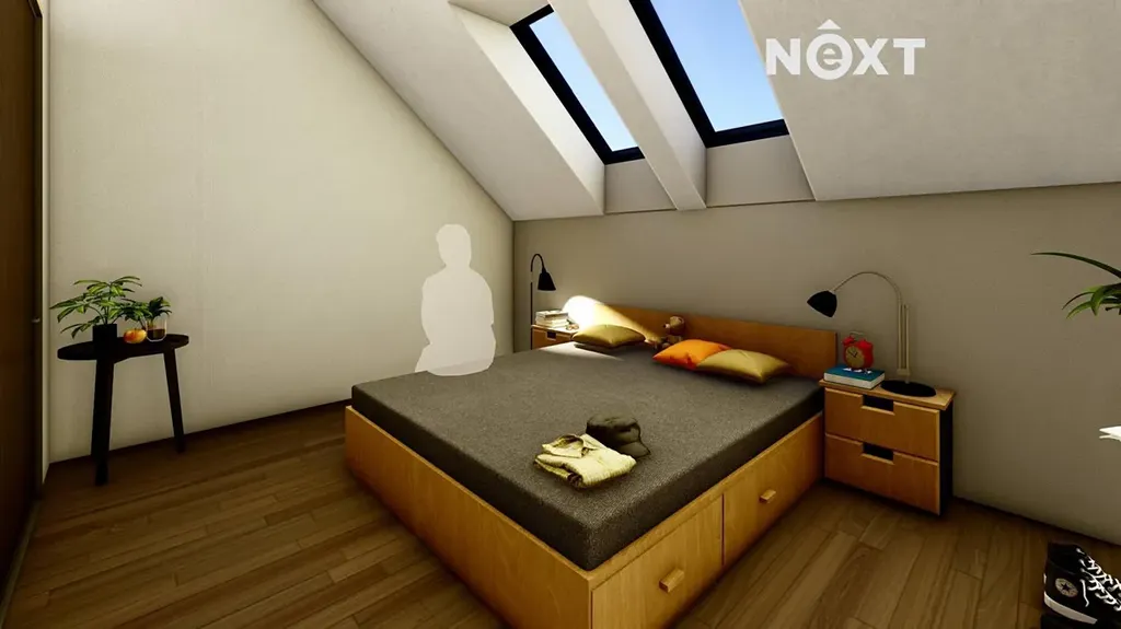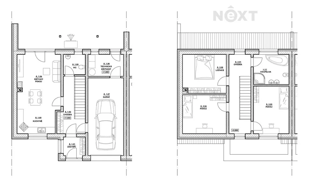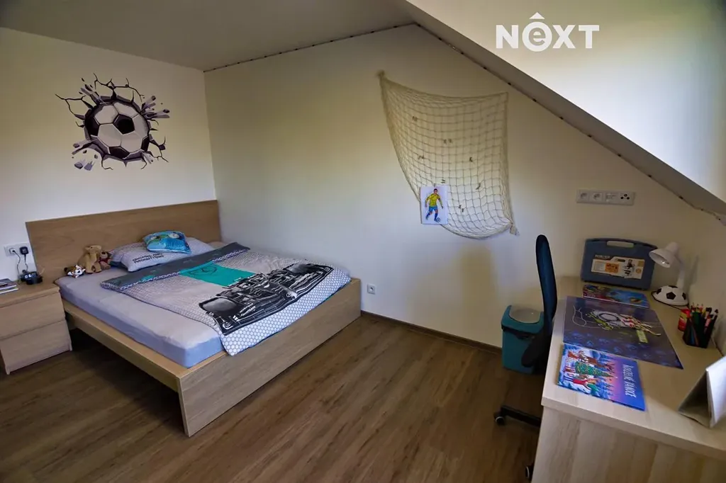 2. NP: Najdete zde tři prostorné ložnice a velkou koupelnu s WC, vanou, sprchou a dvojitým umyvadlem. Z chodby i jedné ložnice je vstup na venkovní balkon s výhledem do klidné části obce.